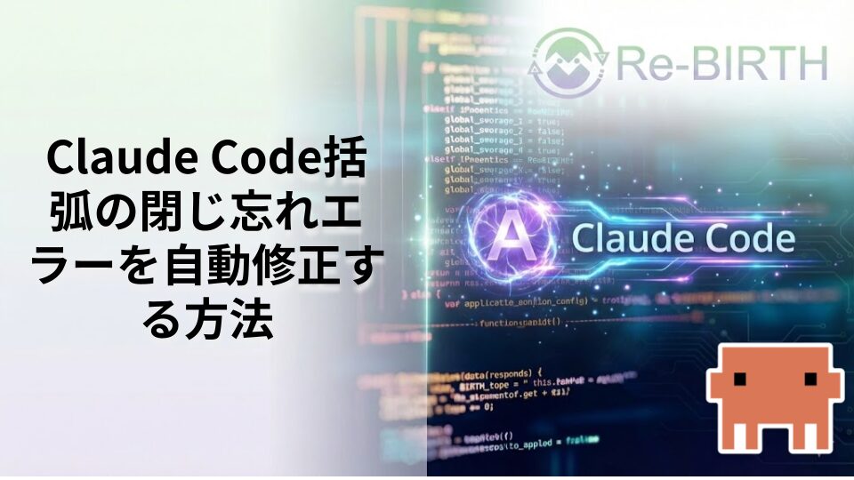Claude Codeで頻発する括弧の閉じ忘れエラーの原因から自動修正機能の活用方法まで徹底解説。エラー検出のコツ、予防策、効率的なデバッグ手順を実例付きで紹介します。プログラミング初心者から上級者まで必見の実践的ガイドです。