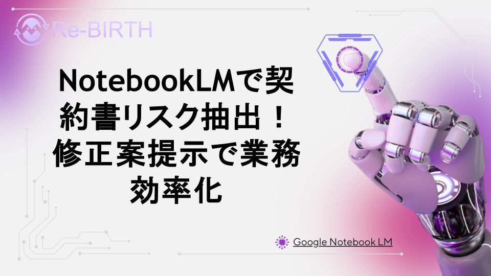 NotebookLMを活用した契約書確認業務の革新的手法を解説。AIによる契約リスクの自動抽出から具体的な修正案提示まで、法務担当者の負担を大幅に軽減する実践的な活用方法を詳しく紹介します。業務効率化と精度向上を両立させる次世代の契約書レビュー手法を学びましょう。