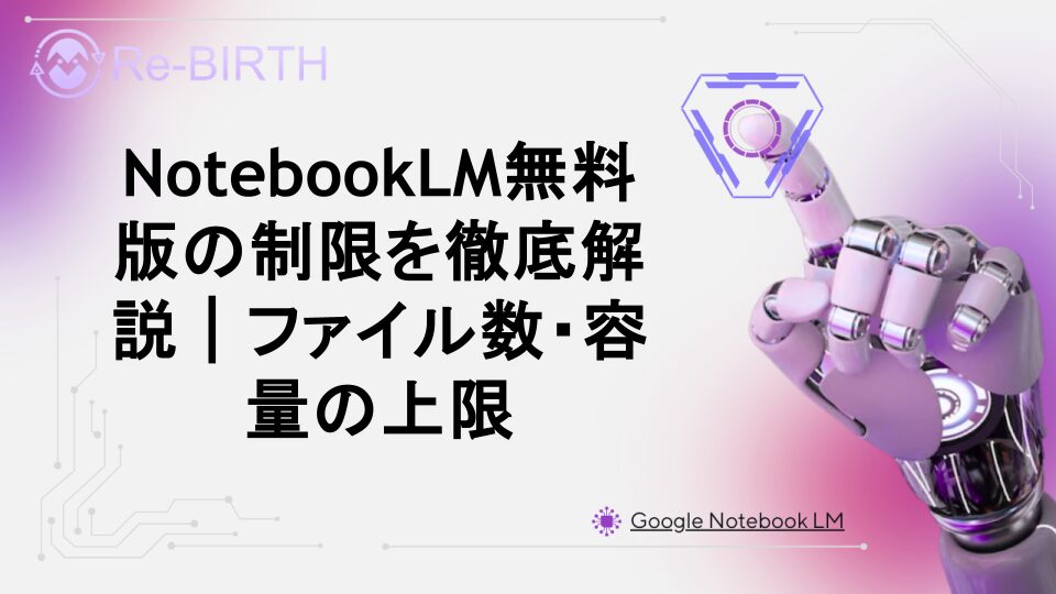 NotebookLMの無料版で利用できる機能と制限について詳しく解説します。アップロードできるファイル数、容量制限、文書の種類、プロジェクト数の上限など、実際に使用する際に知っておくべき情報を分かりやすくまとめました。効率的な活用方法も紹介しています。