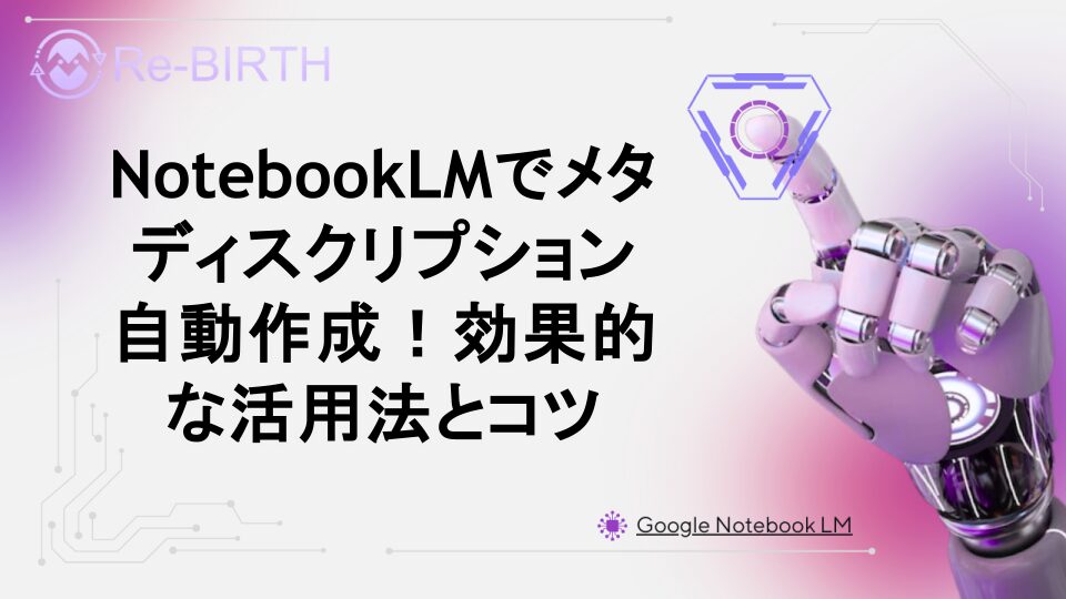 GoogleのNotebookLMを活用することで、この課題を効率的に解決できます。NotebookLMは大量の情報を理解し、要約する能力に優れており、記事の内容を的確に捉えたメタディスクリプションの自動生成が可能です。