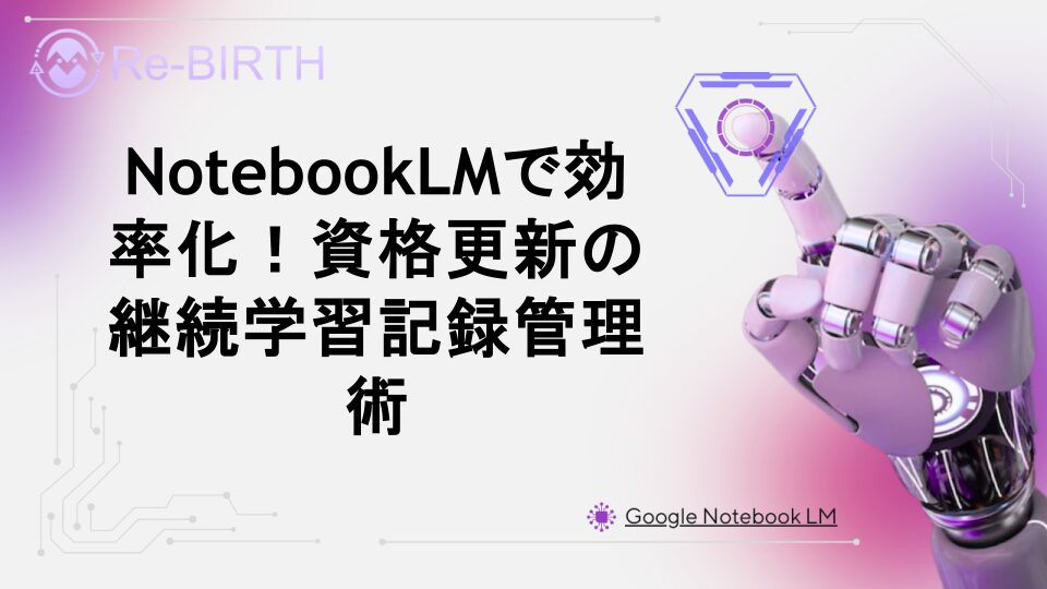 資格更新に必要な継続学習の記録管理に悩んでいませんか?NotebookLMを活用すれば、学習ログの整理から提出書類の作成まで効率化できます。継続学習記録の骨子作成から整理方法まで、実践的なライフハックをご紹介します。