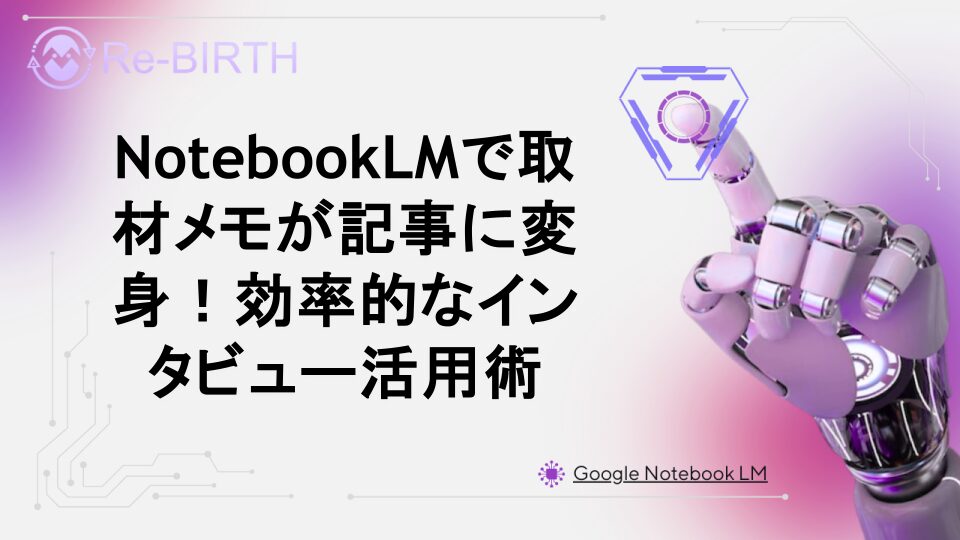 NotebookLMを使えば取材メモから高品質な記事を効率的に作成できます。インタビュー内容の整理、構成提案、文章化まで一貫してサポート。ジャーナリストやライターの生産性を劇的に向上させるAI活用術を詳しく解説します。実際の使用例と具体的な手順で、あなたの取材業務を革新しましょう。