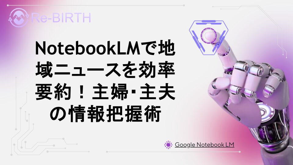 忙しい主婦・主夫でもNotebookLMを使えば地域の重要ニュースを素早く要約・把握できます。学校行事や地域イベント、防災情報など生活に密着した情報を効率的に収集する方法を詳しく解説。AIツールで情報収集の時間を大幅短縮し、家族との時間を増やしましょう。具体的な使い方から活用事例まで分かりやすくご紹介します。