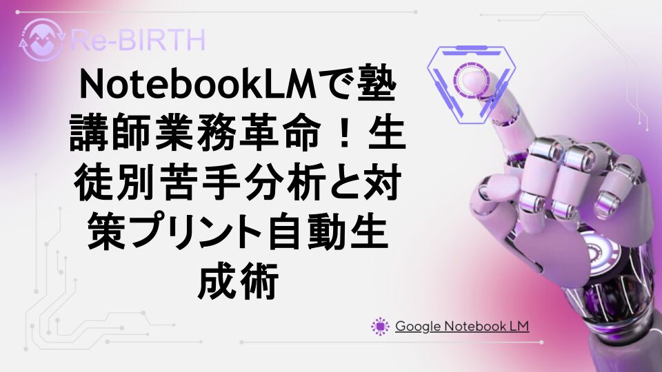塾講師必見!NotebookLMを活用して生徒一人ひとりの苦手分野を的確に分析し、個別対応の対策プリントを自動生成する方法を徹底解説。従来の手作業による教材作成から脱却し、効率的かつ効果的な指導を実現するAI活用術をご紹介します。生徒の学習データから最適な問題を自動選定し、理解度に応じたカスタマイズされた教材作成が可能になります。