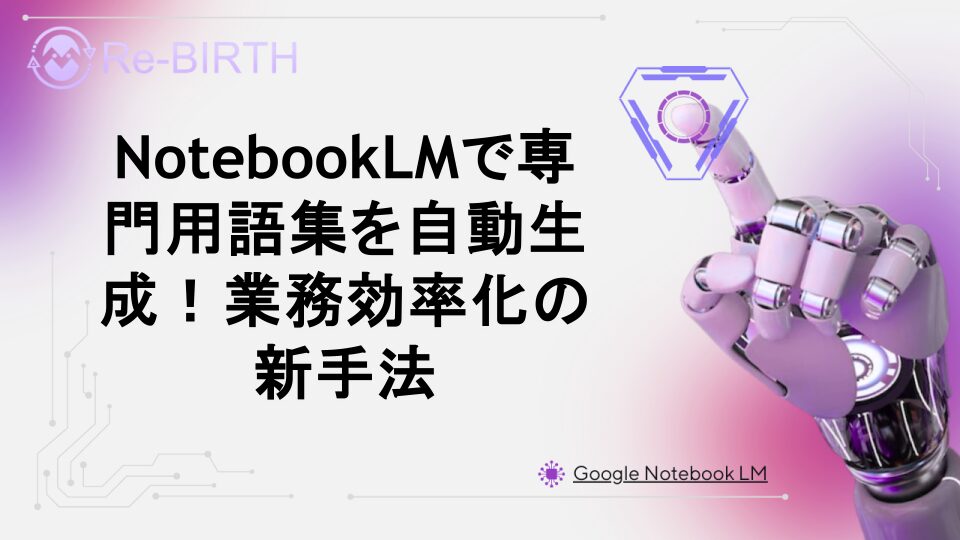 GoogleのNotebookLMを使って専門用語集を効率的に作成する方法を徹底解説。業務文書から自動的に重要用語を抽出し、統一された解説リストを生成するテクニックや実践的な活用事例をご紹介します。従来の手作業による用語集作成から脱却し、AIの力で業務効率化を実現しましょう。