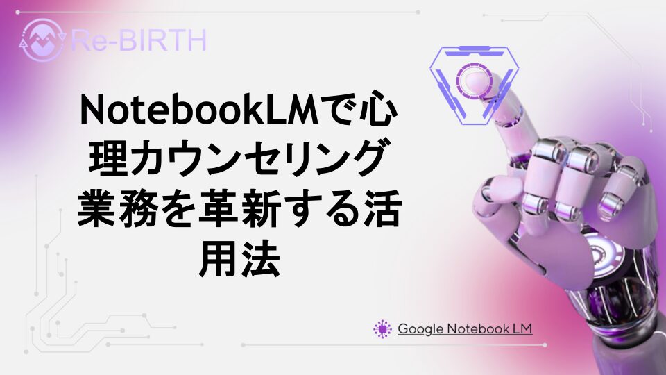 心理カウンセラーがNotebookLMを活用してセッション記録の管理や傾向分析を効率化する方法を詳しく解説。プライバシー配慮の観点から安全な運用方法も紹介し、AI技術を活用した現代的なカウンセリング業務の進め方をお伝えします。