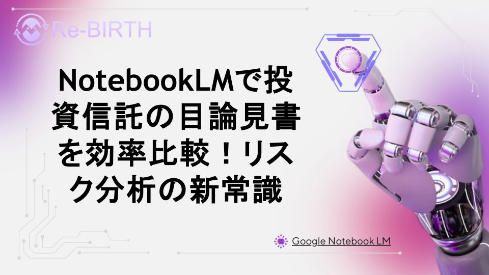 投資信託選びで悩む目論見書の比較作業を、GoogleのAI生成ツール「NotebookLM」で革新的に効率化する方法を詳しく解説。複雑なリスク情報の抽出から比較分析まで、初心者でも簡単にできる具体的な手順とコツを紹介します。