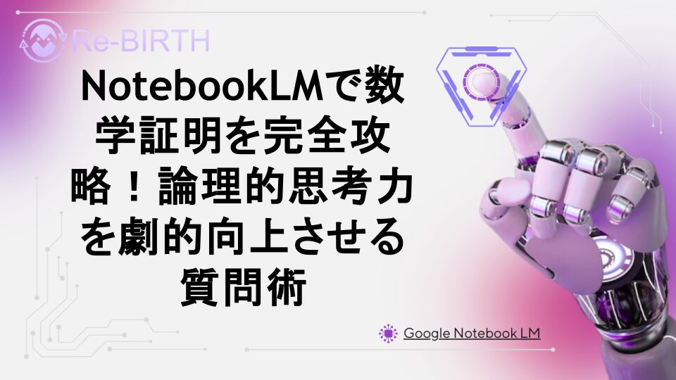 NotebookLMを活用した数学証明プロセスの解説と効果的な質問術を徹底解説。学習効率を最大化し、論理的思考力を向上させる実践的なアプローチを紹介します。AI生成ツールを使って証明問題を体系的に理解する方法を詳しく説明。