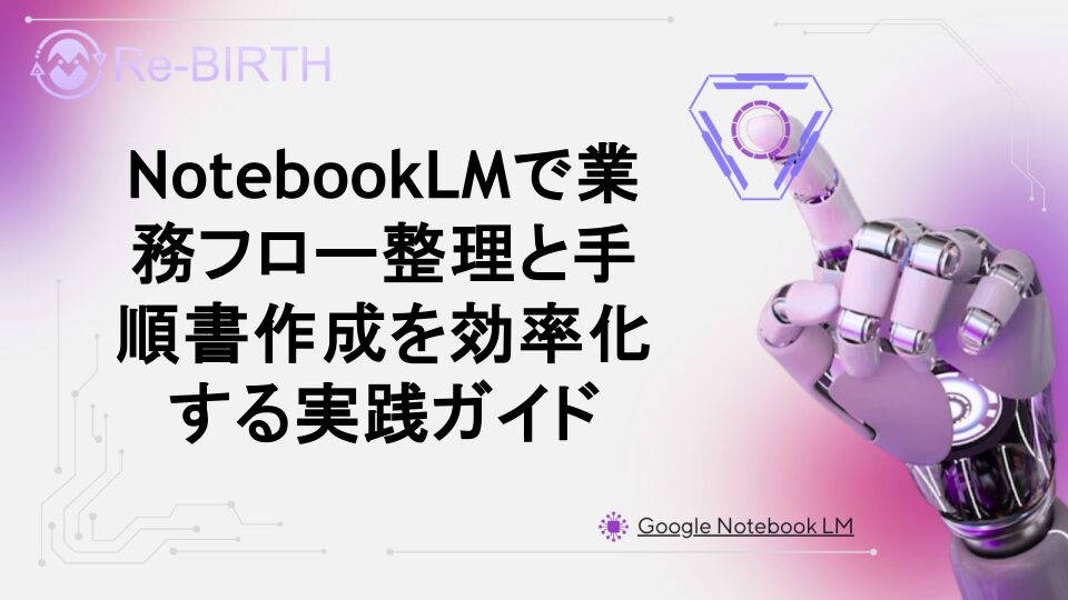 NotebookLMを活用した業務フロー整理と手順書作成の完全ガイド。煩雑な業務プロセスを体系化し、分かりやすいマニュアルを効率的に作成する方法を詳しく解説。実際の導入事例と具体的な手順を交えながら、組織の業務効率化を実現するNotebookLMの活用術をお伝えします。