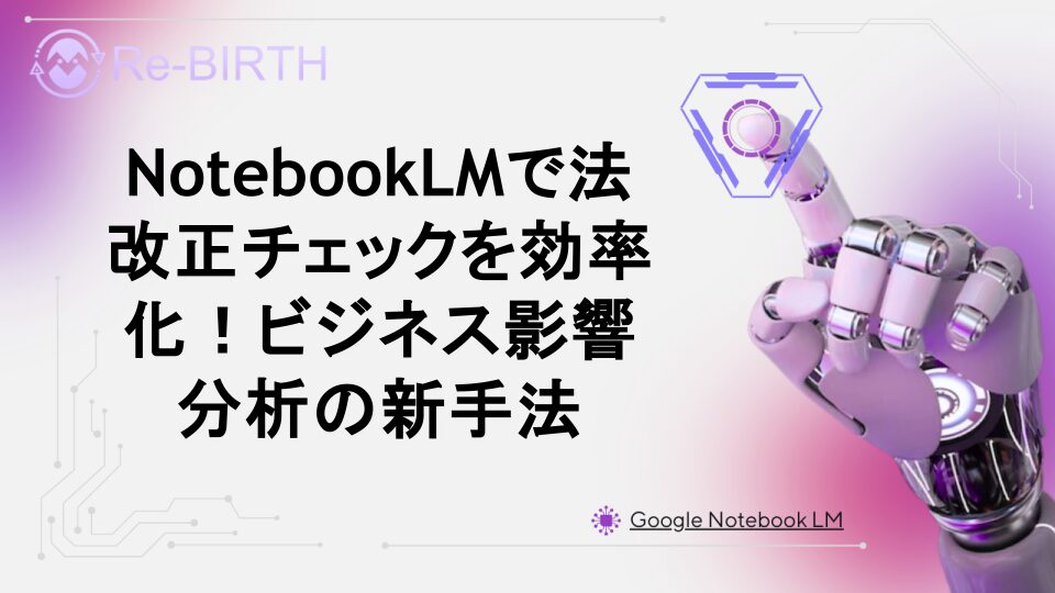 NotebookLMを活用した法改正情報の収集・要約・影響分析手法を詳しく解説。法務担当者やビジネスパーソンが知っておくべきAI活用術で、複雑な法律変更を効率的に把握し、事業への影響を迅速に評価する方法をご紹介します。