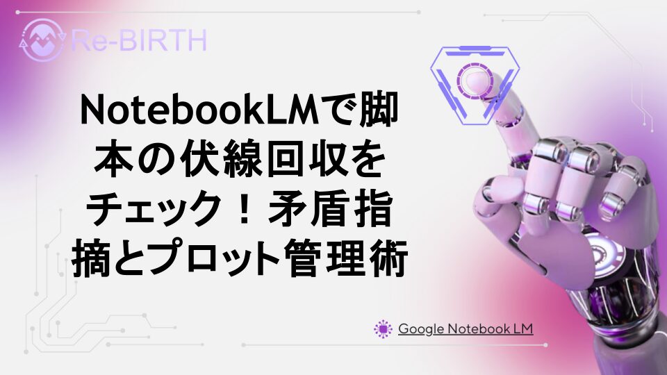 NotebookLMを活用した脚本作成における伏線回収チェックの方法を詳しく解説。プロットの矛盾点を効率的に発見し、ストーリーの整合性を保つテクニックを紹介します。AI生成ツールを使った創作エンタメ分野での実践的な活用法をお教えします。