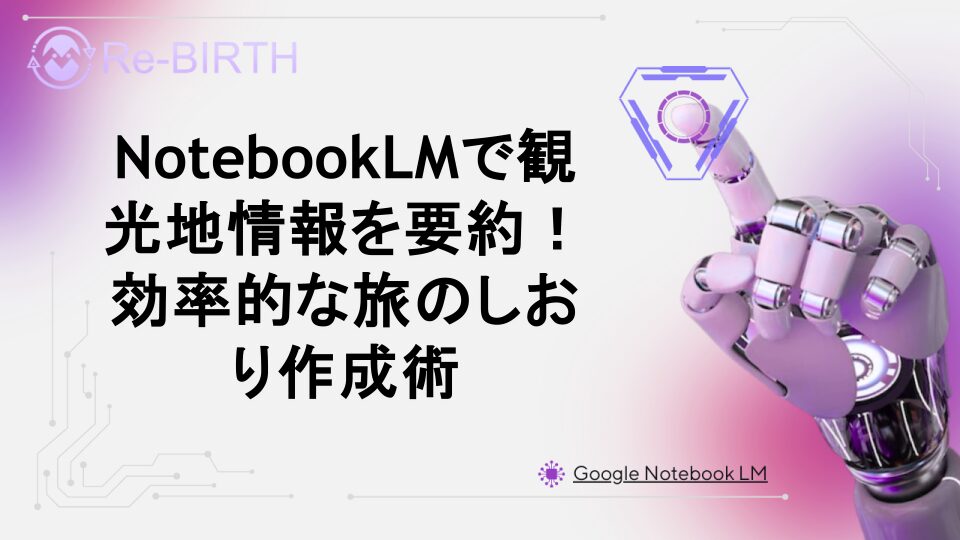 GoogleのAIツールNotebookLMを使えば、観光地の公式サイトや旅行記事を瞬時に要約して、オリジナルの旅のしおりが簡単に作成できます。膨大な情報を整理し、効率的な旅行計画を立てる方法を詳しく解説します。初心者でも今日から実践できる具体的な活用テクニックをご紹介。
