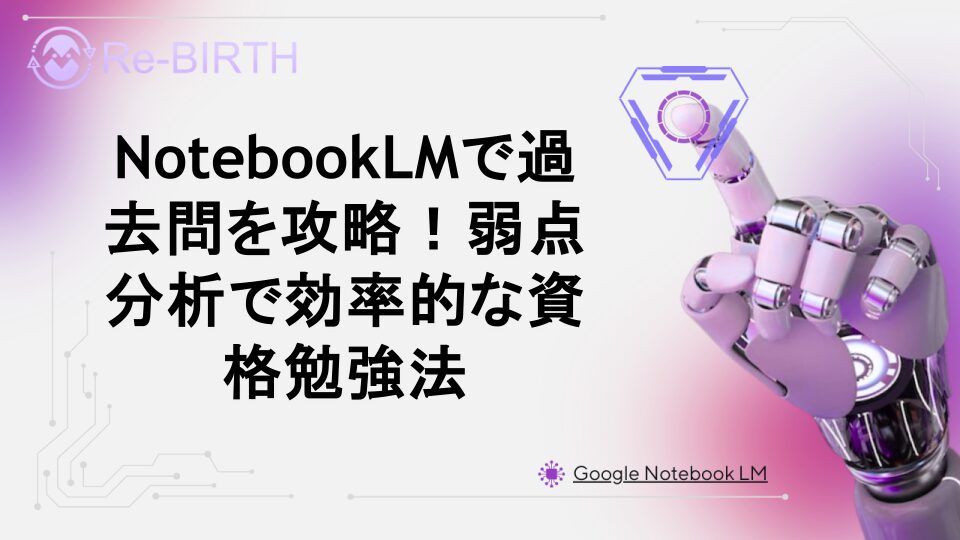 NotebookLMを活用した過去問分析で資格試験の合格率を大幅アップ。AI解説機能による弱点の可視化、個別対策の立案、効率的な学習計画の作成方法を徹底解説。従来の勉強法を革新するAIツールの具体的な使い方をご紹介します。