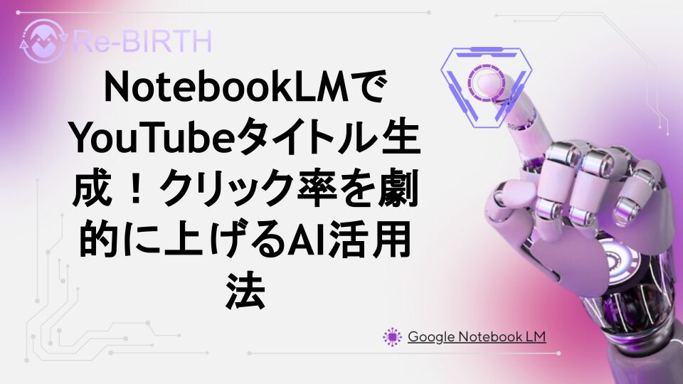 NotebookLMを使ってYouTubeのクリック率を高めるタイトル案を効率的に生成する方法を詳しく解説。AIの力で視聴者の注意を引くタイトル作成のコツ、NotebookLMの具体的な活用手順、成功事例まで完全網羅。YouTubeチャンネル運営者必見のノウハウを公開します。
