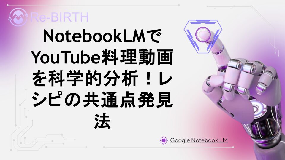 NotebookLMを使ってYouTube料理動画からレシピの共通点を抽出し、科学的根拠に基づいたアレンジ案を生成する方法を詳しく解説。AI技術で料理の本質を理解し、創造的なレシピ開発を実現する革新的アプローチを紹介します。料理系YouTuber必見の分析手法です。