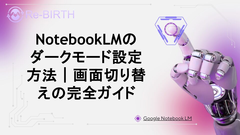 NotebookLMのダークモード設定と画面切り替えの方法を詳しく解説。UI操作の基本から目の疲労軽減効果、カスタマイズオプションまで、初心者向けに丁寧に説明します。作業効率アップと快適な利用環境を実現しましょう。