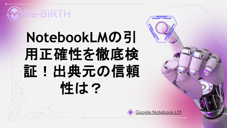 GoogleのNotebookLMが生成する情報の引用正確性を実際に検証しました。出典元へのリンク機能の精度、引用の正確さ、他AIツールとの比較など、研究者や学習者が知っておくべきポイントを詳しく解説します。