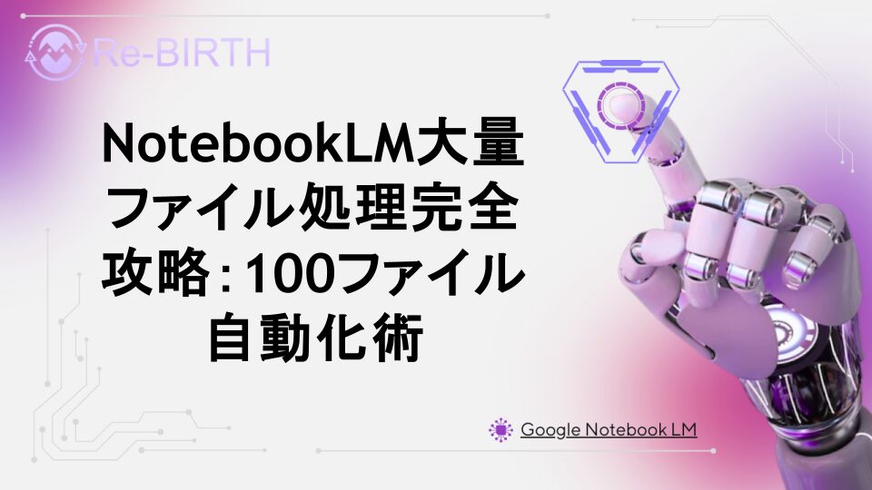 NotebookLMで100ファイルの大量処理を効率化する自動化手法を完全解説。バッチ処理、API活用、ワークフロー構築まで、実践的なテクニックと具体的な実装方法を詳しく紹介します。作業時間を90%短縮する革新的なアプローチを習得しましょう。