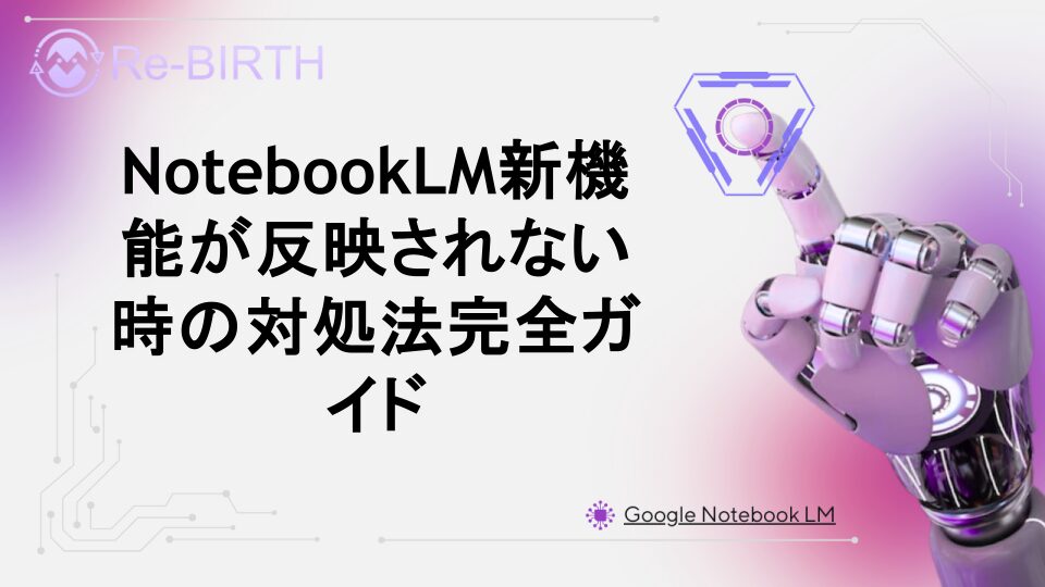 NotebookLMで新機能が表示されない、使えない問題にお困りですか?この記事では、アップデート後に新機能が反映されない原因と、段階的な解決方法を詳しく解説します。ブラウザ設定からアカウント管理まで、すぐに実践できる対処法をご紹介。