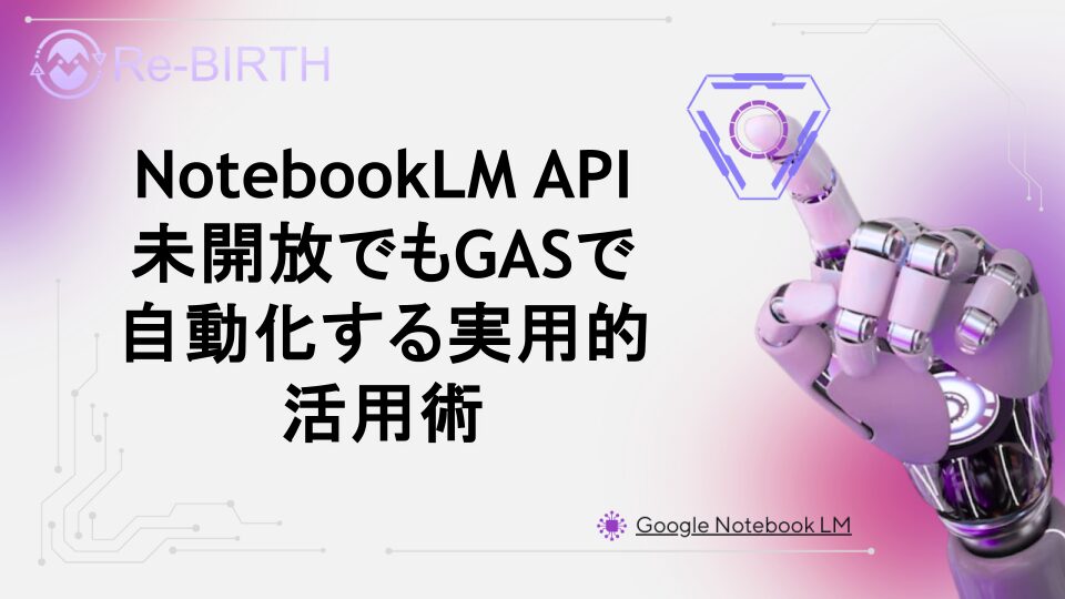 NotebookLMのAPI未開放状況でもGoogle Apps Scriptを活用して操作を自動化する方法を詳しく解説。代替手段としてのGAS連携、スクレイピング技術、データ管理の効率化まで実践的なテクニックを紹介します。