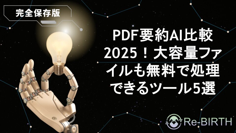 PDF要約AIツールで大容量ファイルも無料で効率的に処理しましょう。2025年最新版として、ChatGPT、Claude、Gemini、専用ツールなど5つの優秀なPDF要約AIを詳しく比較。使い方のコツ、容量制限の回避法、精度を上げるプロンプト例まで実践的に解説します。研究論文、報告書、技術資料の要約作業を劇的に効率化できる方法をお教えします。